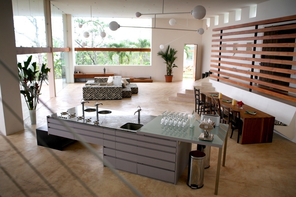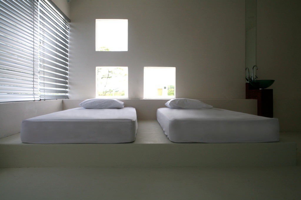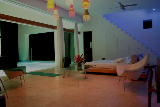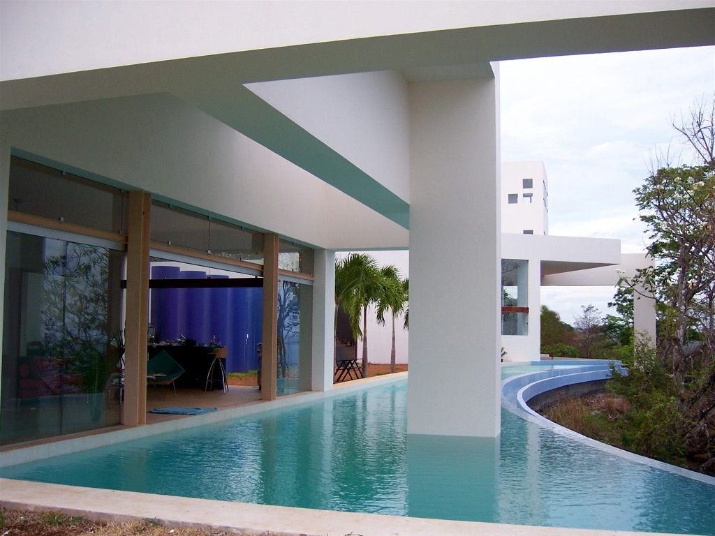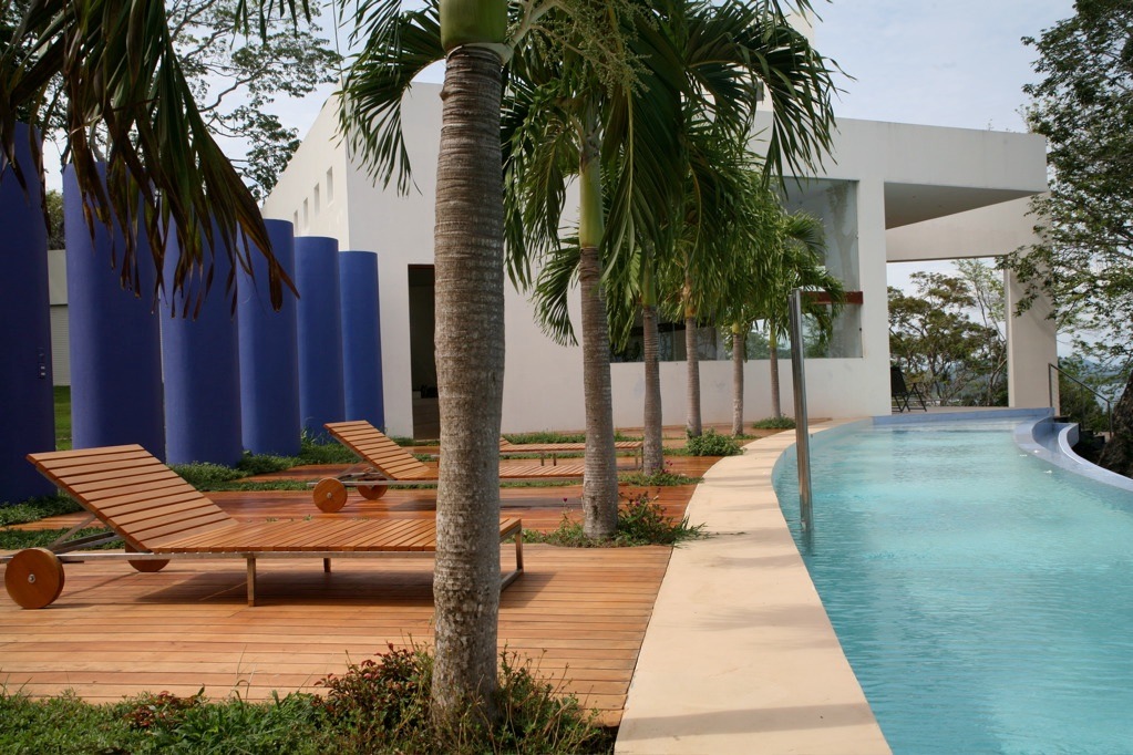 Total measurements of all constructions include: Casa A: 375 m2 or 4,000 ft2 inside space with 180 m2 (1900 ft2) of private decks. Casa B is a 120 m2 (1290 ft2) house and the shared pool deck in between the two houses measures 80 m2 or 860 ft2. Pool size is 130 m2 (or 1400 ft2). The studio at the entrance is comprised of two stories and measures 50 m2. This studio contains a bed loft, living room, kitchen and bathroom.