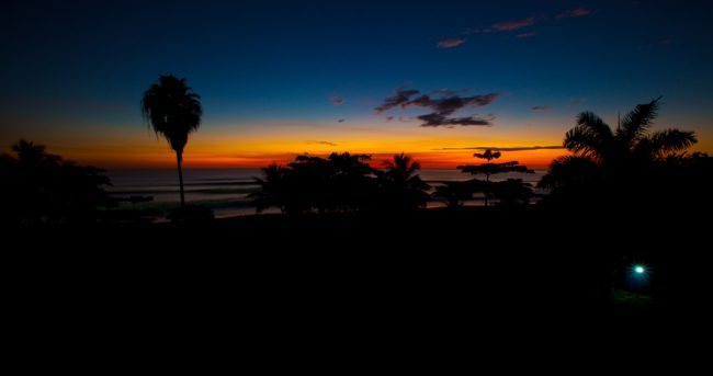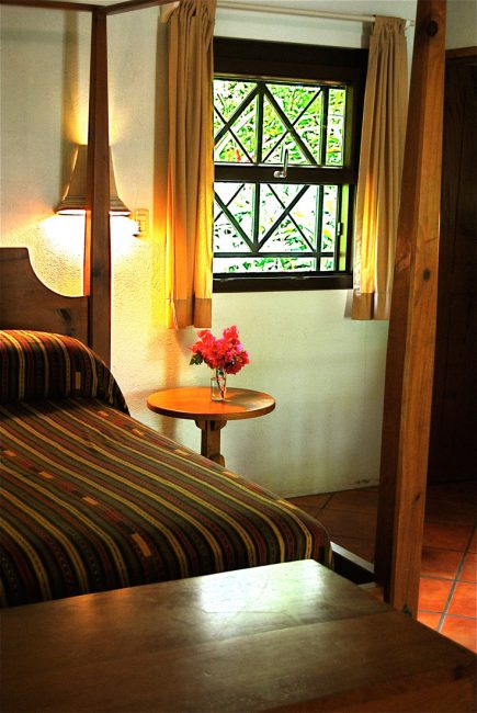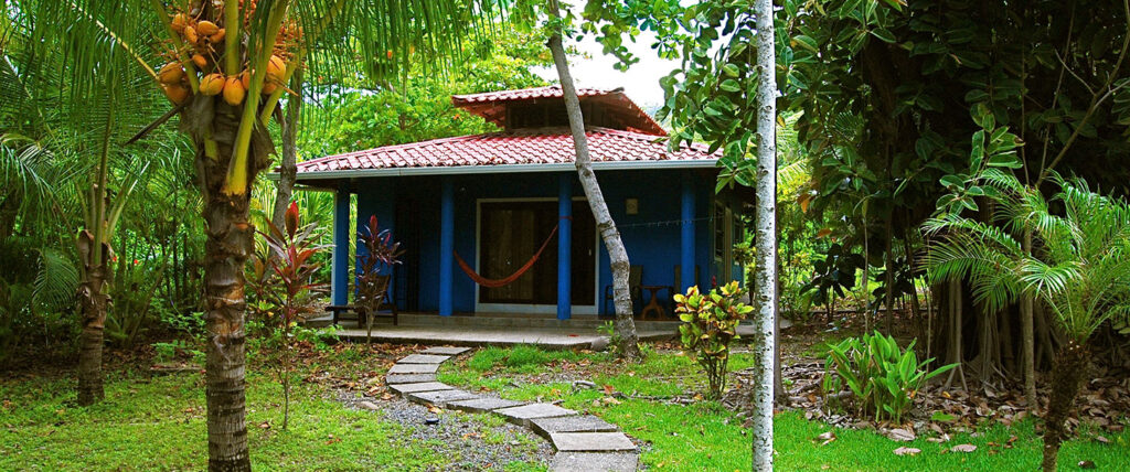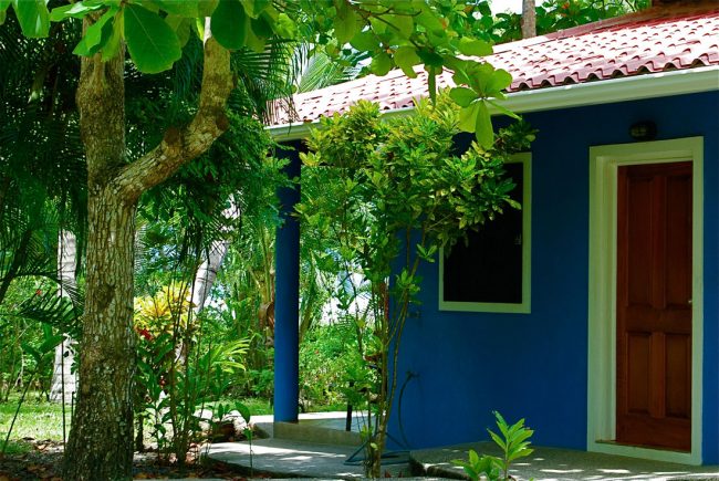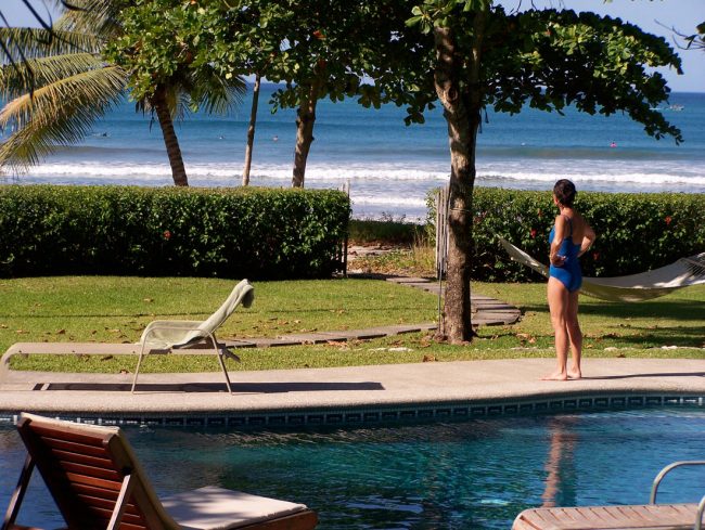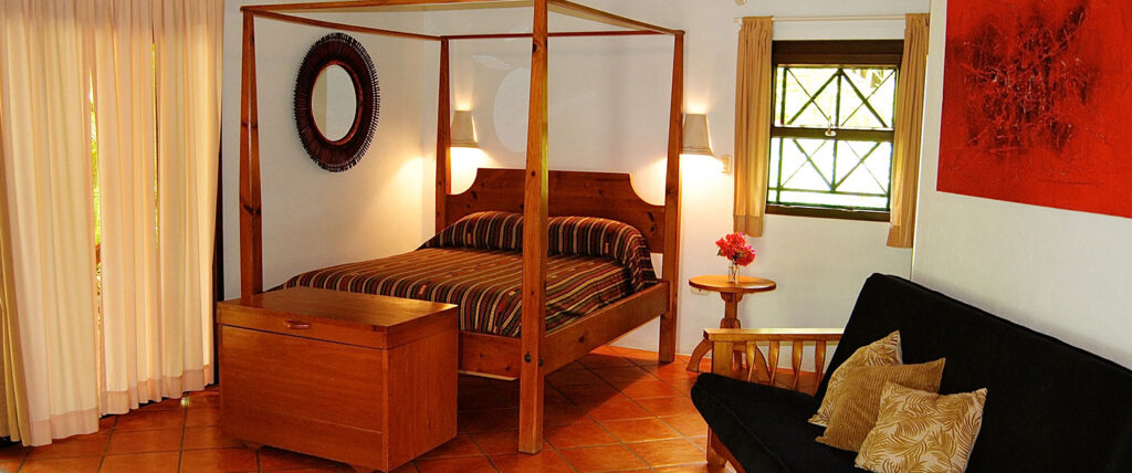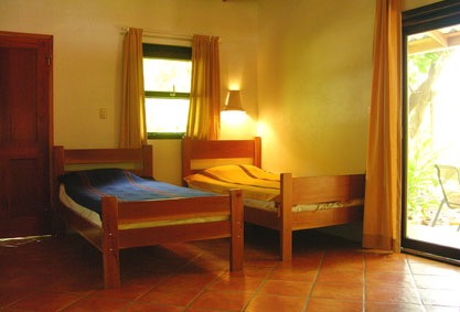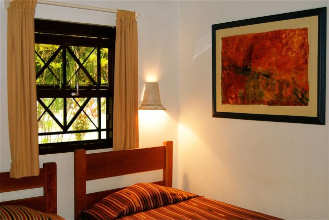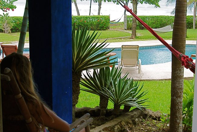 Amenities include a large AC unit, two ceiling fans, a kitchen, lock up box, bathroom and a screened ventilation tower. Five windows and a sliding glass door (all with screens) provide ample natural light and ventilation. The sliding glass door leads to a private patio furnished with tables and chairs, hammock and surf board lockup. The view from the patio looks out towards the extensive tropical gardens as well as out towards the pool, ocean and waves.