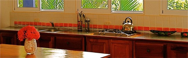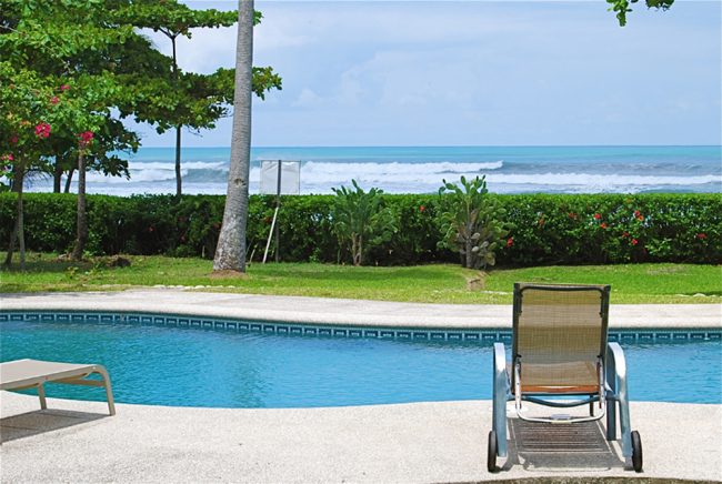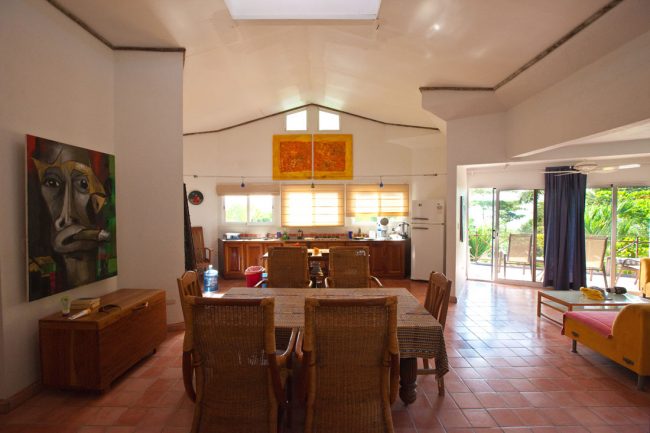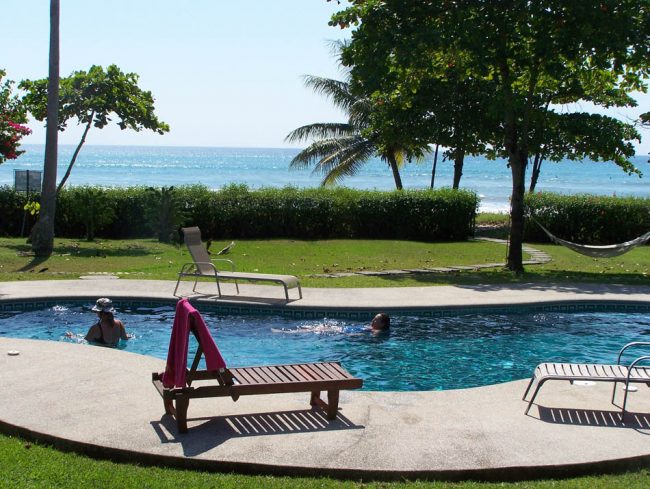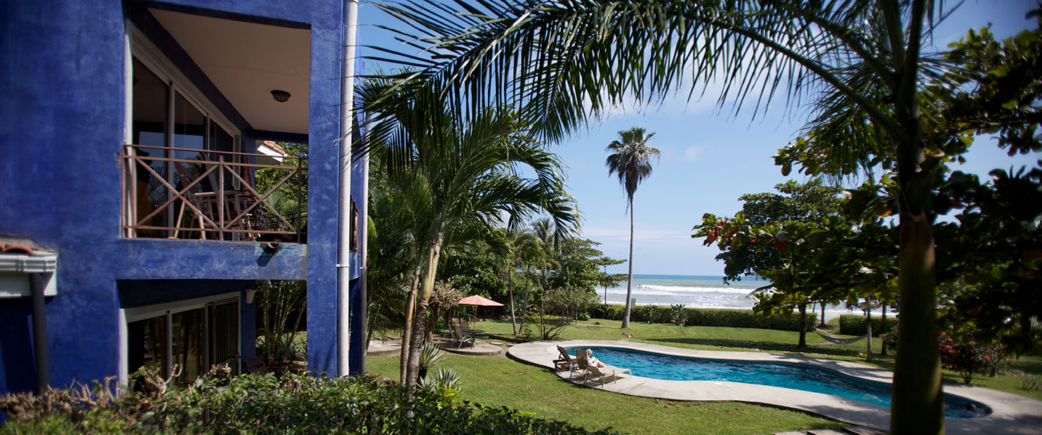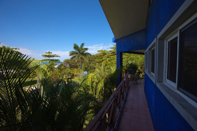 The bottom floor offers three hotel rooms each with private bath situated off a wide central hallway. These downstairs units all have access to a shared kitchen. These rooms can sleep up to 3 people and all face the ocean and pool.