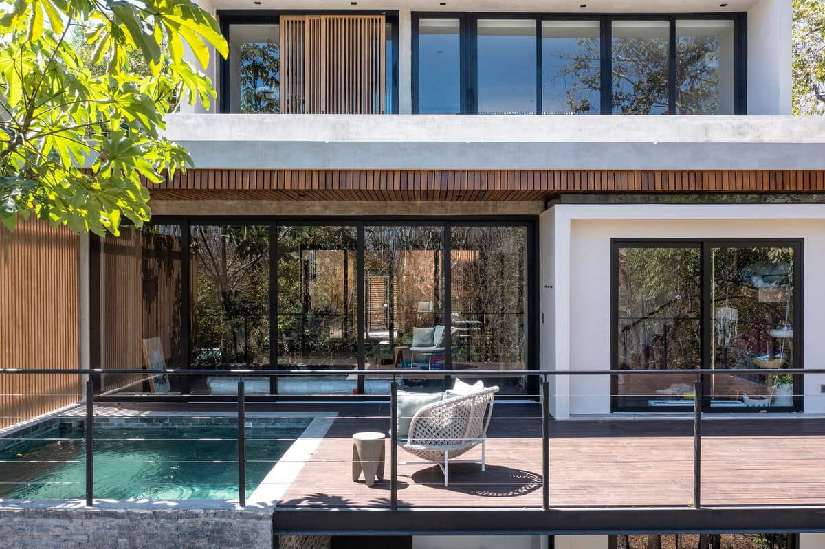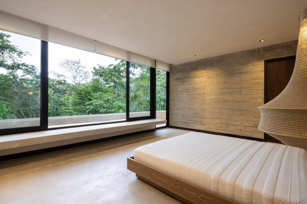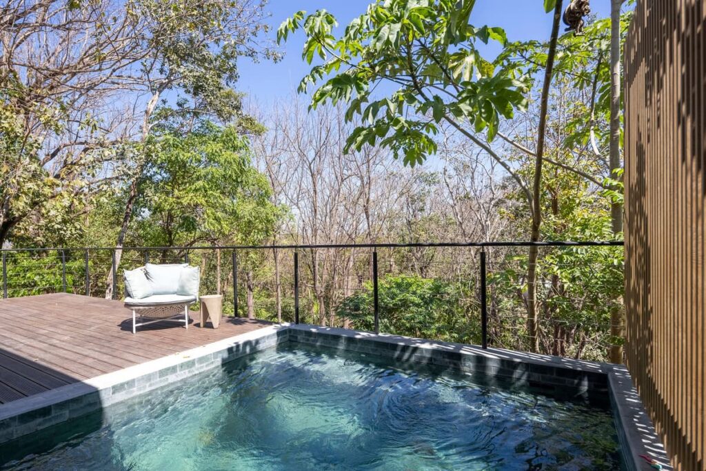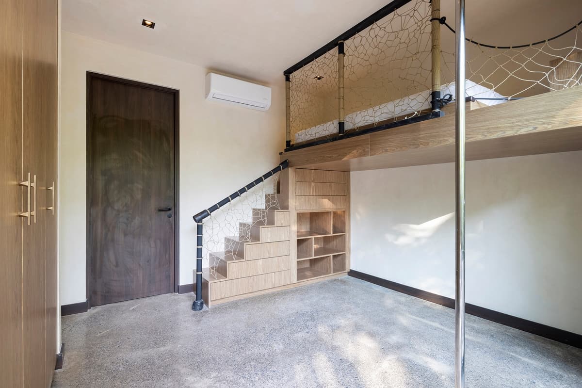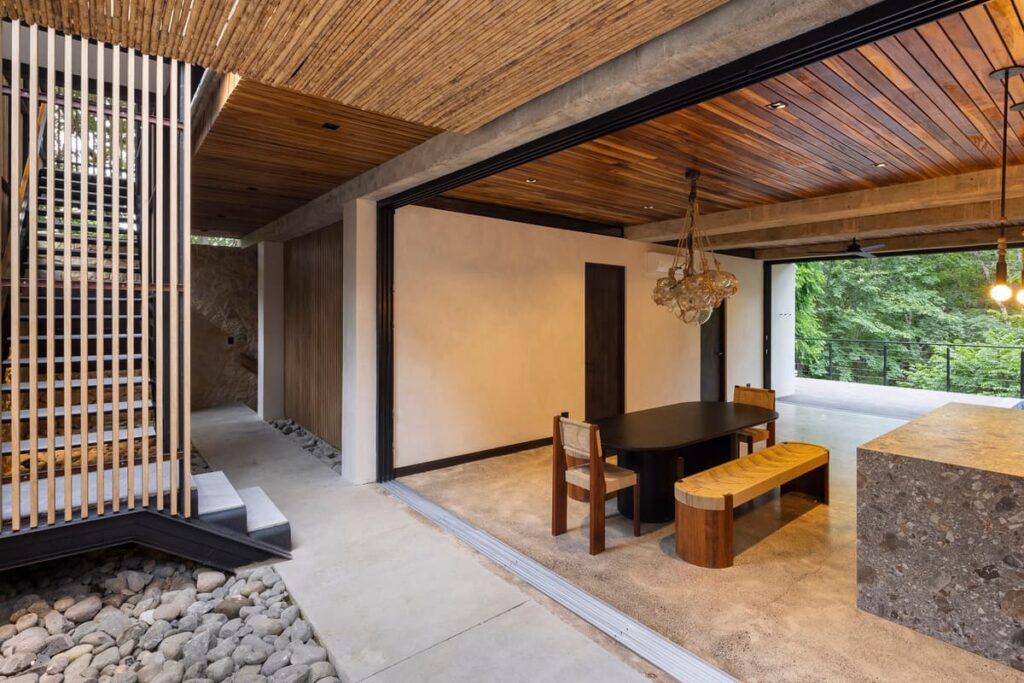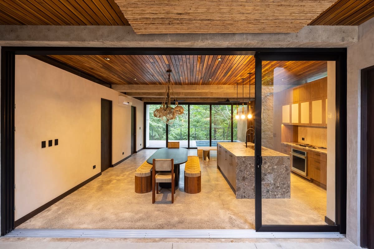 The tropical modern design of the main home features an open-concept kitchen and living area that connects directly to a large deck with a plunge pool overlooking the surrounding jungle canopy. The spacious kitchen features a large island with in-set sink, a dining table with a Lindsey Adelman Knotty Bubbles Chandelier, custom-designed countertops, a built-in dishwasher and refrigerator, a custom Elbrus 5-burner stove, and extensive cabinetry with wall to ceiling cupboard space. Two bedrooms are located on the main floor off the living area. Both feature built-in lofted single beds with storage underneath, which can be removed to accommodate larger beds if desired. These two rooms share a full bathroom. The primary suite occupies the entire second floor, offering a generous layout with a walk-in closet and a large bathroom—including a bathtub positioned to enjoy the jungle views. The fourth bedroom and third bathroom are located on the lower level of the home, making it suitable as a guest room, office, or media room.