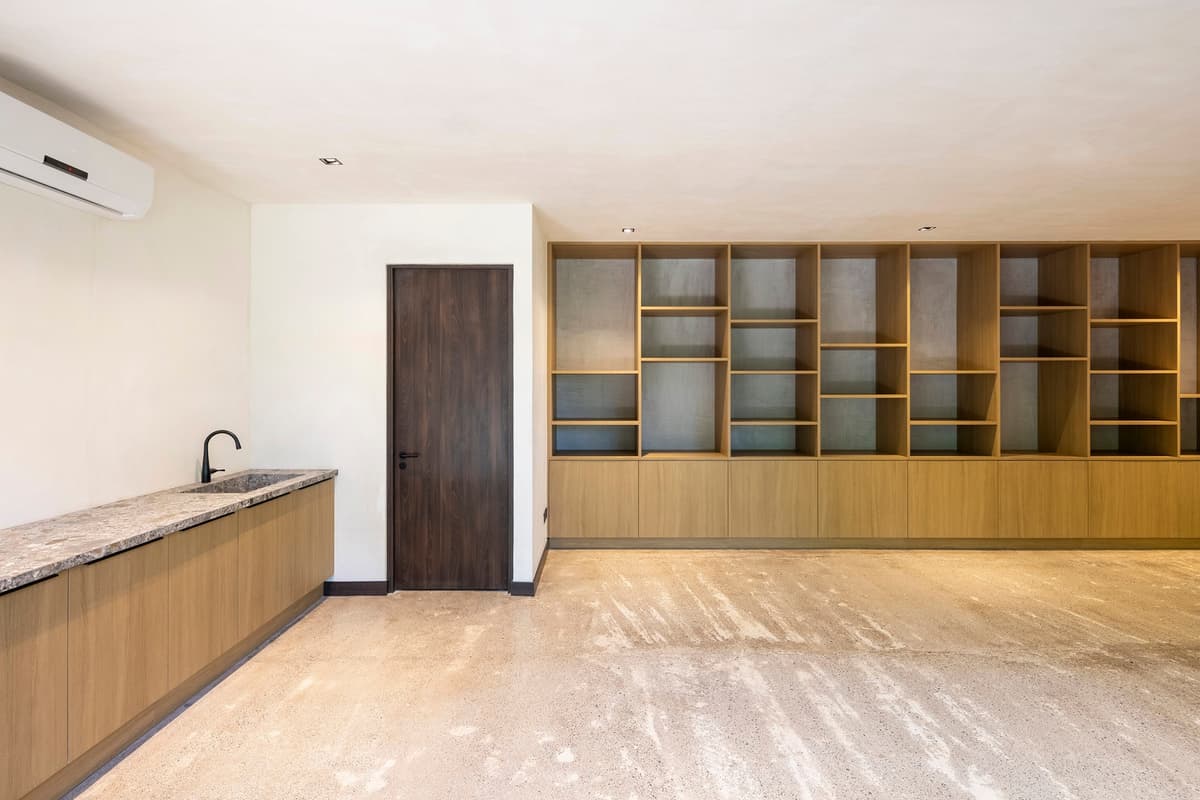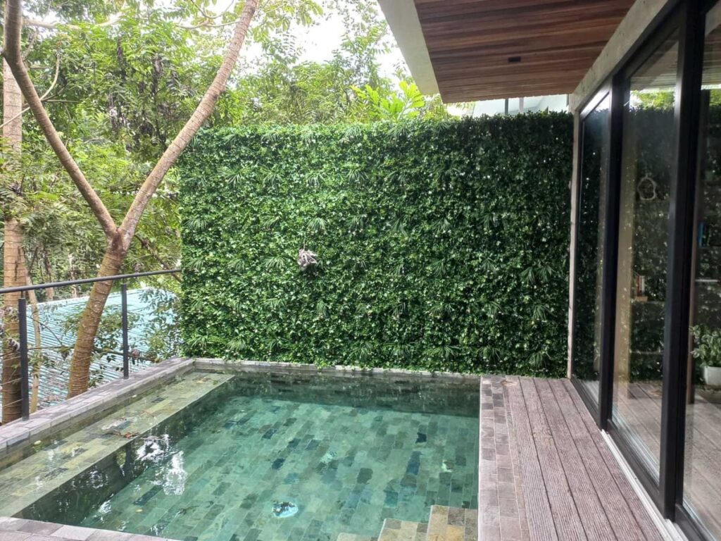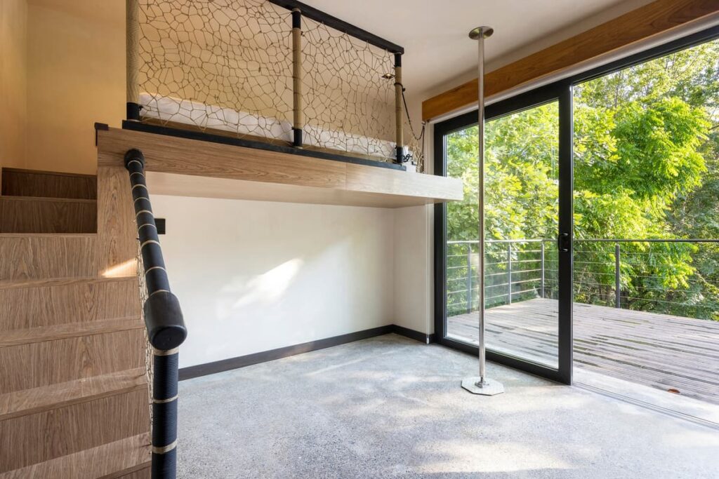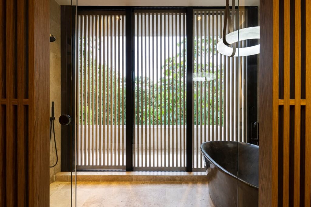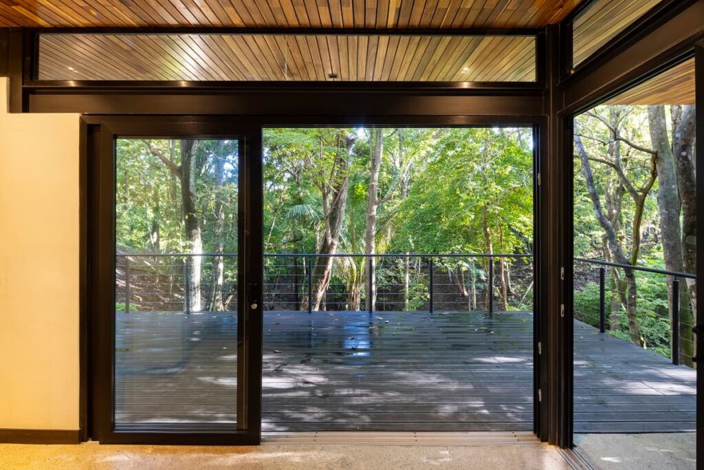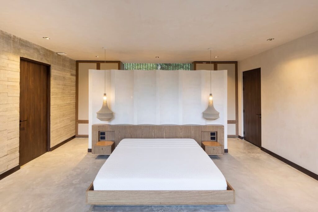 The tropical modern design of the main home features an open-concept kitchen and living area that connects directly to a large deck with a plunge pool overlooking the surrounding jungle canopy. The spacious kitchen features a large island with in-set sink, a dining table with a Lindsey Adelman Knotty Bubbles Chandelier, custom-designed countertops, a built-in dishwasher and refrigerator, a custom Elbrus 5-burner stove, and extensive cabinetry with wall to ceiling cupboard space. Two bedrooms are located on the main floor off the living area. Both feature built-in lofted single beds with storage underneath, which can be removed to accommodate larger beds if desired. These two rooms share a full bathroom. The primary suite occupies the entire second floor, offering a generous layout with a walk-in closet and a large bathroom—including a bathtub positioned to enjoy the jungle views. The fourth bedroom and third bathroom are located on the lower level of the home, making it suitable as a guest room, office, or media room.