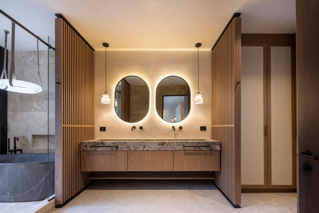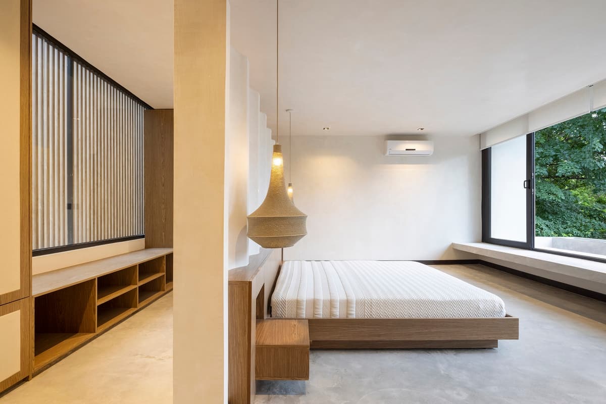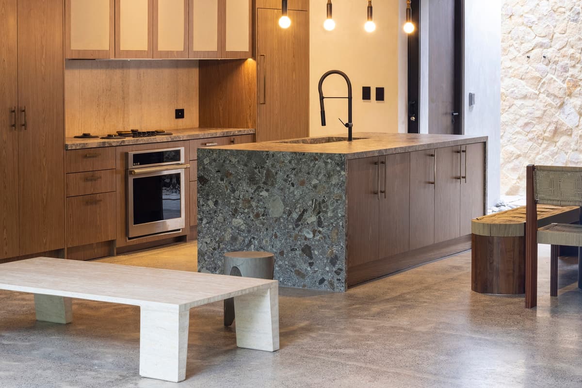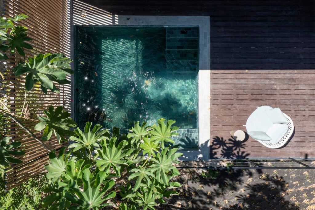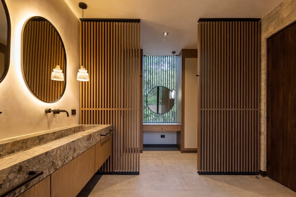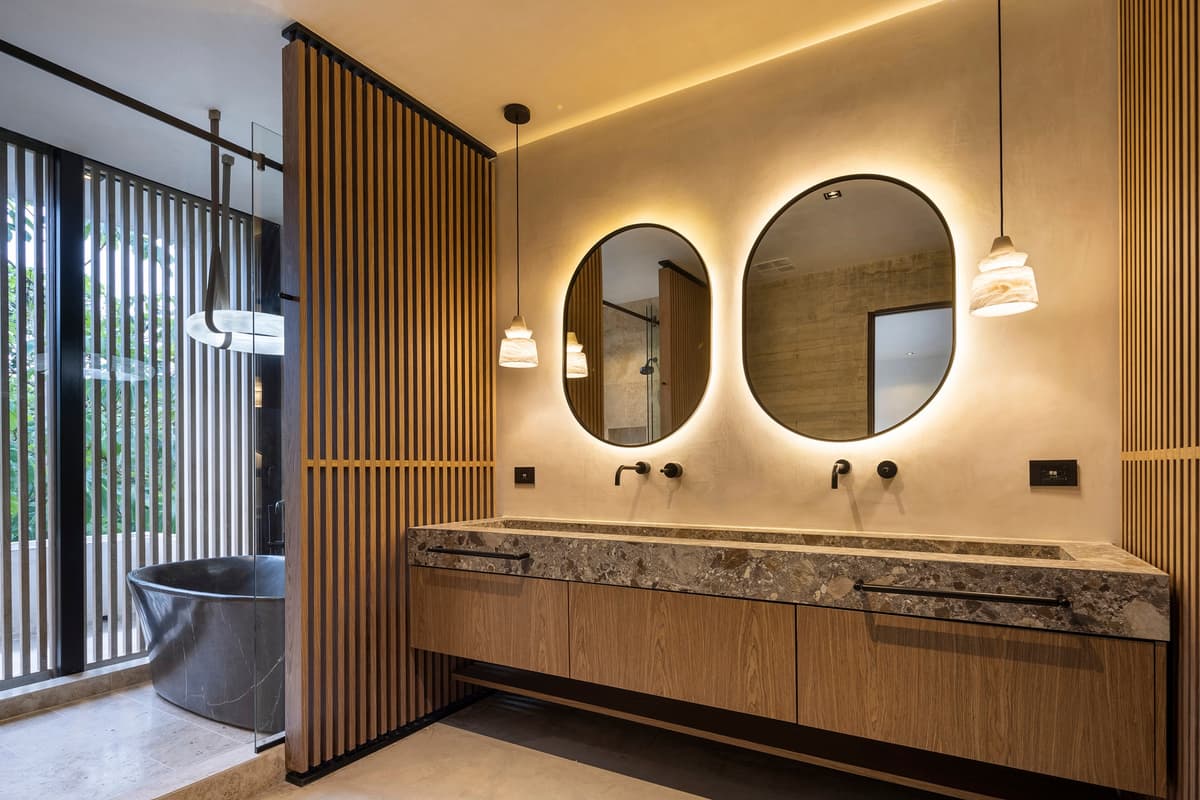 The tropical modern design of the main home features an open-concept kitchen and living area that connects directly to a large deck with a plunge pool overlooking the surrounding jungle canopy. The spacious kitchen features a large island with in-set sink, a dining table with a Lindsey Adelman Knotty Bubbles Chandelier, custom-designed countertops, a built-in dishwasher and refrigerator, a custom Elbrus 5-burner stove, and extensive cabinetry with wall to ceiling cupboard space. Two bedrooms are located on the main floor off the living area. Both feature built-in lofted single beds with storage underneath, which can be removed to accommodate larger beds if desired. These two rooms share a full bathroom. The primary suite occupies the entire second floor, offering a generous layout with a walk-in closet and a large bathroom—including a bathtub positioned to enjoy the jungle views. The fourth bedroom and third bathroom are located on the lower level of the home, making it suitable as a guest room, office, or media room.