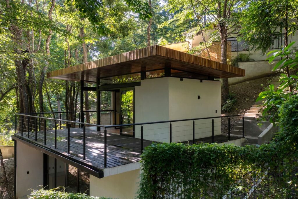 Nestled just below the main house is a detached two-story guest house. The upper level includes a bedroom and bathroom with A/C, large sliding glass doors, and an outdoor deck with a covered kitchen. The lower level is a spacious studio with its own bathroom, kitchen, and abundant storage, opening onto a private garden terrace. Both the main home and guest house are equipped with air-conditioning and are offered unfurnished.